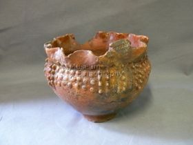 - Agyaga világos sárga-barnára égetett agyag, belül világosbarna, kívül fekete. Alja gömbölyű, válla enyhe íveléssel ment át a rövid egyenes nyakba. Veregető technikával készült. Vállán beböködött ívelő pontsorból álló díszítés látható. Nyakán a perem alatt mély barázda fut körbe.