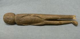 - Barna, fából faragott, nőt ábrázoló szobor. A kidolgozás erősen naturalista, a lábfejek aránytalanul nagyok, a kezek a hason vannak keresztbe téve, a mell lelógó. A fejen a fülek aránytalanul nagyok. A genitáliák gondosan ki vannak faragva. A szobor csípőjén lila és fehér színű fűcsíkokból készített szoknya van. Fején repedt