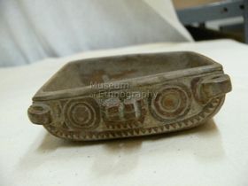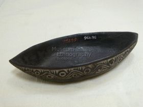 - Ovális alakú, hegyben kicsúcsosodó végű, sötétbarna színű fatál. Két oldalán, nagyjából a teret 2/3-ad arányban kitöltő állatalakú (gyík) mélyített, fehér mésszel inkrusztált, (néhol vörös-színű) tami-stílusú díszítés látható, fenekén jabo motívummal
