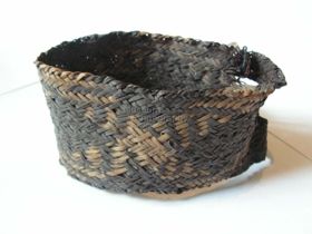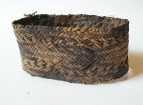 - Alakja alul kissé kiszélesedő, lent kevéssé lekerekített, fent csúcsosan végződő téglalap. Anyaga spanyolnád, mely 8-8 sorosan fut hajlítva körbe. A spanyolnádszálakat hasított spanyolnádcsíkok fűzik egymáshoz, a peremen ugyanilyen anyagból készített, finom futás megy végig. A hátoldalon a fogó ugyancsak spanyolnádból készült, a pajzs hossztenge...