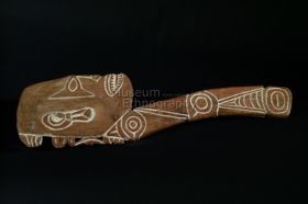 - Vajszínű, nagyon könnyű és puhafából faragott, hengeres nyelű, egyik végén európai vasfokost utánzó faragással, másik, evezőlapátszerűen kiszélesedő végén bevésett és piros, fekete festékkel, illetve fehér kagylómésszel kiszínezett, a kokorramintára emlékeztető rajzolat, mindkét oldalán. Festetics közli a fotóját a múzeumnak küldött tárgyak közö...