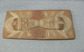 - Egy darab fából faragott oszlop. Alsó részére nőalak van faragva, fölötte kétszer halfejfaragvány van. Legfelül halfarok módjára kiképzett részben végződik. Színezése vörös, fehér és fekete.
