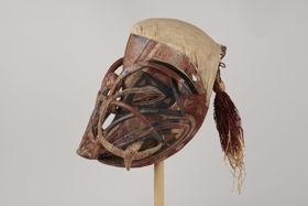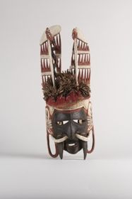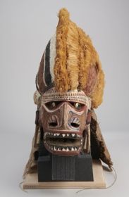 - Rotangnádvázra erősített faháncsanyagból készített tárgy. Arcrésze fehér. Orra plasztikusan kialakított, szemei fehérre festett, fél kókuszdiók, áttört szemnyílással, körülötte piros körrel és fekete pöttyökkel. Szája fölött fekete rostanyagból készített bajusz. Fogai kutyafogakból készültek. Szája alatt messzire kiugró, lapos ovális, fekete ros...