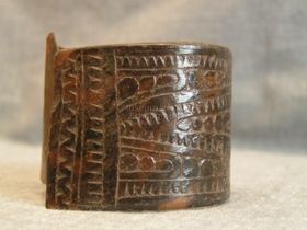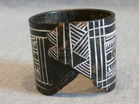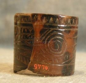 - Hengeresre hajlított teknőshéj. Szine sötétbarna világossárga áttetsző foltokkal. Végei egymásra hajlanak. Külső felületén karcolt geometrikus minázatú. A hosszanti oldallal párhuzamosan, a szélein kettő ill. három párhuzamos fut végig, a felsőt farkasfoggal tölti ki, az alsó részben a legszélsőt kis dölt háromszögek, minden második vizszintes ...
