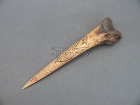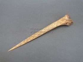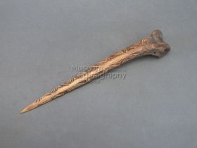 - Kazuár félbevágott combcsontjából készítették, természetes színű, alul hegyben , felül a forgócsont által képzett, négy helyen átfúrt markolatban végződő, faragott, emberarcból és geometrikus motívumból állódíszítéssel ellátott eszköz.