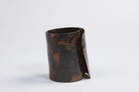 - Hengeresre hajlított tenkőshéj. Szine sötétbarna, világossárga foltokkal. Áttetsző. Végei egymásra hajlanak. Külső felületén karcolt geometrikus minázatú áttört teknőchéjkarperec: szélein 3-3 párhuzamos vonal, a két-két külső között farkasfog. Az áttörés egy koncentrikus kör és egy-egy ovális lyuk, ezen formákat követik a motivumok. Farkasfog ve...