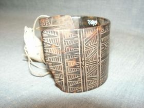 - Hengeresre hajlított teknőshéj. Szine sötétbarna. Végei egymásra hajlanak, a külső töredezett. Külső felületén karcolt geometrikus minázatú. Keskenyebb szélével párhuzamosan szem motivum osztja két részre. A szélső részekben négy, egymással derékszöget alkotó szemotívum található, amely igy virágra hasonlító formát ad ki, a vizszintesek farkasfo...