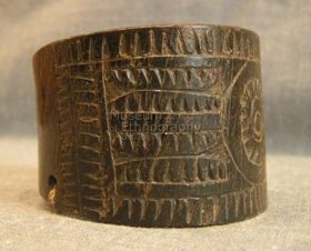 - Hengeresre hajlított teknőshéj. Szine sötétbarna világossárga áttetsző foltokkal. Végei egymásra hajlanak, a külső töredezett. Külső felületén karcolt geometrikus minázatú. Keskenyebb szélével párhuzamosan, a külső szélén öt párhuzamos vonalak van. A karkötő közepén KANKAN minta van, attól balra egy téglalap három oldalát körbezáró farkasfogmint...