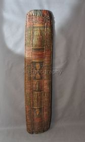 - Fából faragott, téglalap alakú, lapos tárgy. Hátsó felülete sima, díszítetlen, középen fogóval. Elülső felülete mélyített, egy hosszanti irányban végighúzódó vonaltól kétoldalt szimmetrikusan elhelyezkedő motívumsorral díszített. Ennek mélyített vonalai fehérrel vannak inkrusztálva, a kiemelkedő részek vörös és fekete színűek. A tárgy hosszanti ...