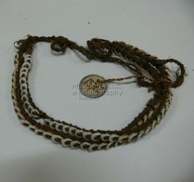 - Két egymás mellé kötött rostzsinór, egyik oldalán rávarrott két Nassa csigásorral, és két végén díszítetlen kötözővel. Bíró jegyzet 548