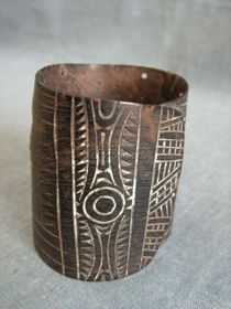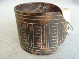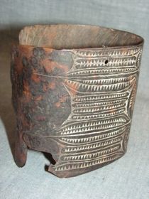 - Hengeresre hajlított teknőshéj. Színe sötétbarna világossárga áttetsző foltokkal, végei egymásra hajlanak, széle repedezett. Külső felületén felületesen karcolt geometrikus mintázat borítja, inkusztálva. A vízszintes oldalaival párhuzamos vonalak osztják négy részre, ezeken belül fogasfogsorok két helyen pedig oválisok diszitik. A két szélső fel...
