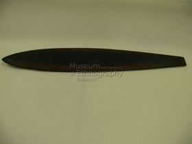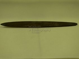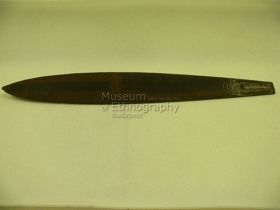 - Fekete keményfából faragott sáslevél alakú tárgy, egyik oldalán teljes hosszában mélyitett fehérrel inkosztált diszítés, a másikon csak középen van néhány elmosódott, bevágott vonal. Középen lyuk, amiben fonal van.