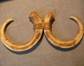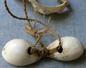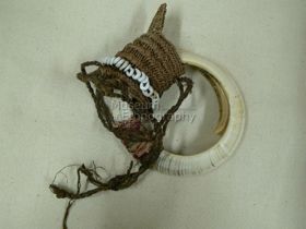 - Két középen piros színű hánccsal egymás mellé kötözött, fehéres színű, az egyik peremén cakkozott Conus karikából készített disz. Bíró-jegyzet: 561