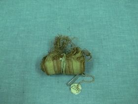 - Kötényhez (=női szoknya) való alapanyag. Szőtt szalag, világos alapszínnel, díszítésként lilás csíkokkal.