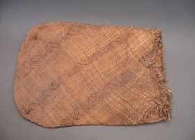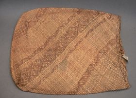 - Levélfonat szatyor Átlós szálfutás, vászonkötés, a natúr sárga alapon keresztbe futó barna csíkokkal, benne fonott mintával. Lekerekített aljú, szegett szájú.
