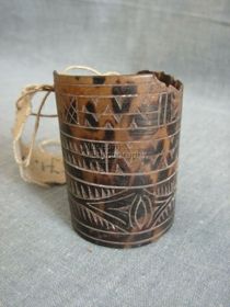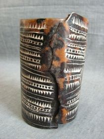 - Barnás színű, helyenként áttetsző, henger alakú, teknősbékahéjból készített tárgy. Végei egymásra hajlanak. Külső felületét két sávban elhelyezett fehérrel inkusztrált, geometrikus motívumokból álló díszítések borítják. Egyik végén alul és felül két kis lyuk van.