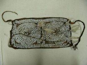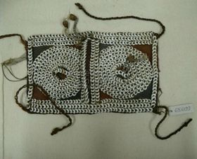 - Fekete gyökérből készült rostokból font térdkötő. Egyik oldalán két füllele, és geometrikus minta szerint ráerősített Nassa-csigákkal, amik két téglalapot képeznek, benne két-két oválissal. Textilcédulán Bíró-jegyzet: 501 Sattelberg felirattal.