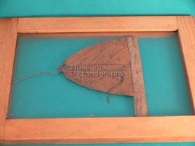 - Halászsárkány. Megbarnult falevél. Az eredetileg ovális alakú levél harmada le van vágva.A vágott végén cikcakkos varrás zárja le. Középen függőlegesen madzag van hozzáerősítve, amely alul és felül hosszan folytatódik. Üvegkeretben tárolva.