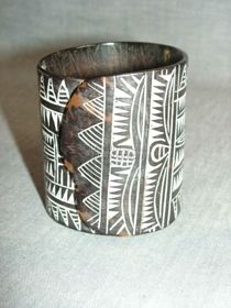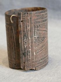 - Hengeresre hajlított teknőshéj. Színe sötétbarna világossárga áttetsző foltokkal. Végei egymásra hajlanak, szélei töredezettek. Külső felületén karcolt geometrikus mintázat borítja, fehérrel inkusztálva. Keskenyebb szélével párhuzamosan sok párhuzamos vonal fut, a középsőben középen kör KEMATEN szélein helykitöltő farkasfog. A vízszintes oldalai...