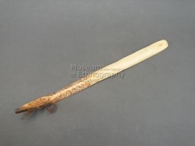 - Sárgás-barnás színű nádszál, amelyre hosszú, kétágú, fonott zsinór van erősítve, a zsinór végén egyik oldalán emberarc faragással díszített búgófával. A nyelet kazuártoll díszíti.