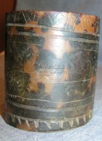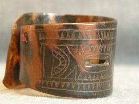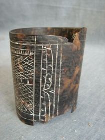 - Hengeresre hajlított teknőshéj. Színe sötétbarna világossárga áttetsző foltokkal,lhegyesedő végei egymásra hajlanak. Külső felületén felületesen karcolt geometrikus mintázat borítja. Középen keskeny csikban KALIKALI, a szélein párhuzamosra keresztben rajzolt apro vnalak. Textilcédulán a Biró jegyzet száma 571 hh