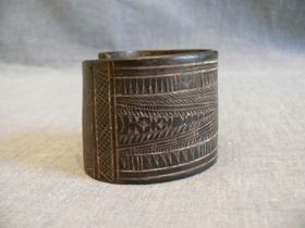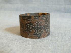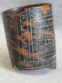 - Hengeresre hajlított teknőshéj. Szine sötétbarna világossárga áttetsző foltokkal. Végei egymásra hajlanak. Külső felületén vésett geometrikus mintáza borítja, fehérrel inkusztálva. A függőleges oldalával párhuzamosan egy csíkban MAGOLATAL minta fut, párhuzamos két vonal, beljebb háromszögek, melyek belsőbb sora párhuzamosokkal van kitöltve. A ...