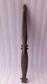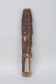 - Álló férfialak. Keményfából faragott, élénk festésű, színe foltokban fehér, vörös és fekete. Két lábát alul nem köti össze talapzat, a lábfejek lefelé nyúlva vannak ábrázolva. Térdeit szögletes kiugró rész jelzi. Lábfejei fehér színűek, alsó lábszárai közül az egyik vörös, a másik fekete, a térdeknél kiugró faragás fekete és vörös, a térd környé...