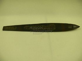 - Kemény fából készült, sötétbarna színű, sáslevél alakú vékony lap. Egyik oldalán mélyített díszítések, amelyek közül az egyik emberarcot, a többi emberszemeket ábrázol. Egyik végén mindkét oldalon 6,2 és 6,5 cm hosszúságban mélyített vonalas és fűrészfogas díszítés van, egyik végén átfurt lyukkal.
