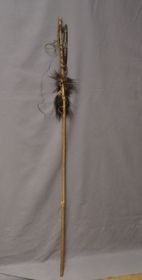 - Kemény faanyagból készült, vörösesbarna színű, sáslevél alakú vékony lap. Mindkét oldala mélyített faragással díszített. Az egyik oldalon emberi arc, csillagalak és hullámvonalak, a másikon arcfestési motívum és hullámvonalak láthatók. Egyik végén mindkét oldalon 7 cm mélyített fűrészfogas díszítés, felső végén átlyukasztással. A díszítéssel fe...