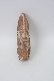 - Világos színű, kemény faanyagból faragott férfialak. A szobor oszlop alakú, alsó része egy vékonyabb és egy vastagabb hengerből áll, ezen van maga alá húzott lábakkal elhelyezve az ember alakú rész. Férfijellegét penise mutatja, a testtől különállóan faragott karjai a combra támaszkodnak, ahol mind az öt ujj jelezve van. Arcrésze kiemelkedően fa...