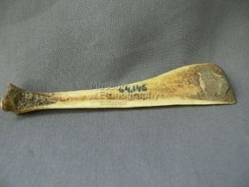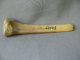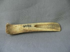 - Hosszúkás, feketés színű fából faragott, hegyes pálcika, felső részén a fogó kígyót alakban hullámzik, feje is ki van faragva. Bíró-jegyzet: 556.