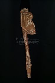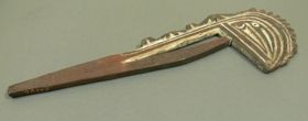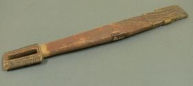 - Lapos, keményfából készített tárgy. Két vége korongszerűen van kiképezve, ívelt középső összekötő részén két helyen át van lyukasztva. A tárgy egész felülete mélyített, fehérrel inkrusztált motívumokkal van díszítve, a minták többsége fűrészfogsorokból és ívelt vonalakból áll.