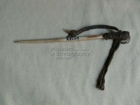 - Barnás szinti, egyik végén ferdén levágott, hegyes, másikon megvastagodó, barnás rostfonatra erősített Nassa-csigákkal díszített törpe kenguru csontja. Biro jegyzet 562b