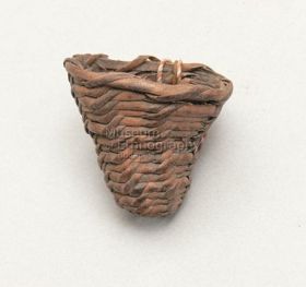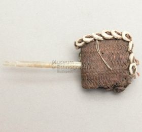 - Barnás színű, fából hajlított, lapos tárgy, alul hegyben végződik, felső része közel derékszögben meghajlik, a hajlásnál két helyen áttört, felső részén rostra felfűzött fehér kagylóhéjak vannak erősítve, hátul egy-egy, elöl két-két sorban. Bíró-jegyzet 602