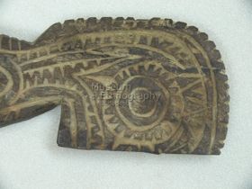 - Hosszúkás, barnás színű, bambuszból hasított, hegyes pálcika, amelynek fogója hullámvonalas kígyót ábrázol. A kígyó alatti részen néhány bevagdosott díszítés. Bíró-jegyzet: 556.