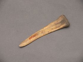 - Hosszúkás, világosbarna színű fából faragott, hegyes pálcika, felső részén hullámvonalas faragással és kígyófejjel. A kígyó ábrázolás és az alatta lévő rész karcolásokkal díszített. Bíró-jegyzet: 556.