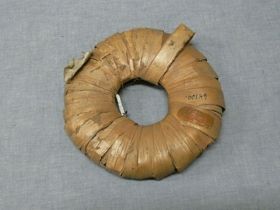 - Egymásra helyezett, öt lapos fahasítékra (leírókarton alapján, valószínűleg azt Bodrogi Tibor írta) tekert, fonott növényrostokból készített gyűrű alakú tárgy. Gyűrű alakú tárgy, amit fonott növényi rostokkal tekertek be