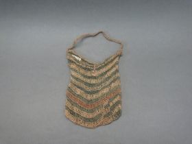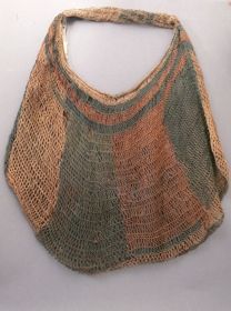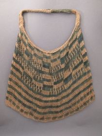 - Növényi rostokból készített, hurkolt technikájú, fehéres, kopott fekete és vöröses színű szatyoralakú tárgy. Legnagyobb része fekete, középen egy vörös sáv. Bíró-jegyzet: 509/g.