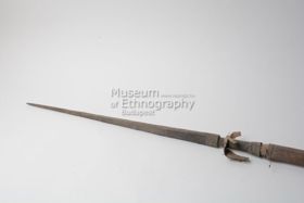 - Egyrészes dárda. Fából faragott, hengeres keresztmetszetű, két vége felé elhegyesedő tárgy. Felső harmadában 20 cm-es hosszúságban, két oldalt kifaragott kis szakákkal és körbefutó, vésett meanderekkel díszítették.