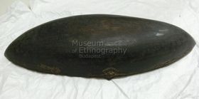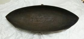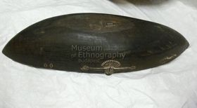 - Ovális alakú, hegyben összefutó végű, feketés színű, gondosan kidolgozott fatál, kétoldalt eltérő tami-stílusú díszítésekkel.