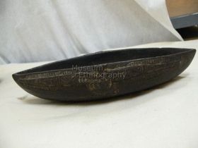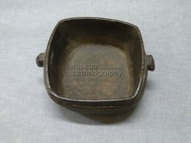 - Ovális alakú, csúcsban összefutó végű, feketés színű fatál. Kétoldalt és fenekén az egyik vég felé összefutva tami-stílusú, vegyes elemekből álló díszítés.