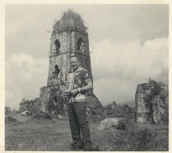 Maurice Biscocho at Cagsawa ruins with Mt. Mayon volcano in background, Philippines, 1967 / Albert Speer