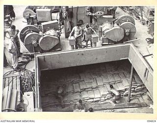 TOL, NEW BRITAIN, 1945-08-04. TROOPS OF 28 INFANTRY BATTALION WORKING IN THE HOLD OF AMERICAN FIELD SERVICE SHIP, NO. 283, UNLOADING CEMENTAustralian War MemorialImage Papua New Guinea Online
