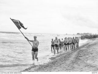 TOROKINA, BOUGAINVILLE, 1945-07-08. MEMBERS OF THE TEAM REPRESENTING THE ROYAL NEW ZEALAND AIR FORCE SURF LIFE SAVING CLUB, LED BY STANDARD BEARER FLYING OFFICER D. HOGAN (1), TAKING PART IN THE ..Australian War MemorialImage Papua New Guinea Online