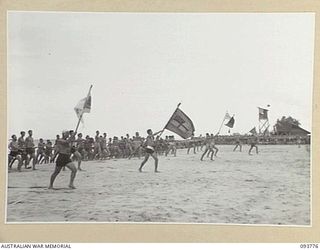 TOROKINA, BOUGAINVILLE, 1945-07-08. A LINE UP OF COMPETING TEAMS WHO TOOK PART IN THE MARCH PAST IN THE CHAMPIONSHIP SURF CARNIVAL CONDUCTED BY ARMY AMENITIES SERVICE, 4 BASE SUB-AREA, AT NO. 4 ..Australian War MemorialImage Papua New Guinea Online