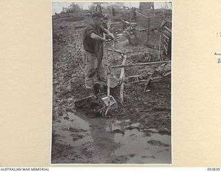 YAMIL AREA, NEW GUINEA, 1945-07-06. SERGEANT G.T. WILDE, MACHINE-GUN PLATOON, D COMPANY, 2/5 INFANTRY BATTALION, MANAGING TO DO HIS WASHING AMONGST THE MUD AND SLUSH CAUSED BY THE HEAVY RAIN WHICH ..Australian War MemorialImage Papua New Guinea Online