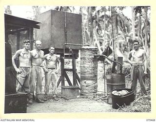 KALAI PLANTATION, NEW BRITAIN. 1945-03-07. A CRUDE LOOKING BUT VERY EFFECTIVE HOT WATER SYSTEM DESIGNED AND MADE BY VX147321 PRIVATE W.E. SLADE (1) FOR USE AT THE 6TH FIELD AMBULANCEAustralian War MemorialImage Papua New Guinea Online