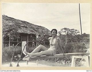 LAE, NEW GUINEA. 1944-10-31. LIEUTENANT S. DAMMAN, 2/8 GENERAL HOSPITAL, RECLINING IN THE SUN AT THE AUSTRALIAN NEW GUINEA ADMINISTRATIVE UNIT SWIMMING POOL IN HER HOME MADE TWO-PIECE SWIM SUITAustralian War MemorialImage Papua New Guinea Online