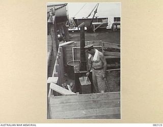 AT SEA. 1944-10-27. LANCE-CORPORAL M.S. LE FAUCHEUR, 101 FIELD SECURITY SECTION (1), ACTING AS COOK ABOARD THE SS JAMES OLIVER DURING MOVEMENT TO NEW GUINEA OF ELEMENTS OF THE FIRST ARMYAustralian War MemorialImage Papua New Guinea Online