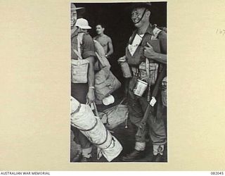 CAIRNS, QLD. 1944-10-28. PRIVATE H.J. DUIGAN (1), AND CORPORAL K.W. HUNTER (2), MEMBERS OF B COMPANY, 2/4 INFANTRY BATTALION, ARE BOTH WELL PREPARED AS THEY BOARD THE USS MEXICO DURING EMBARKATION ..Australian War MemorialImage Papua New Guinea Online